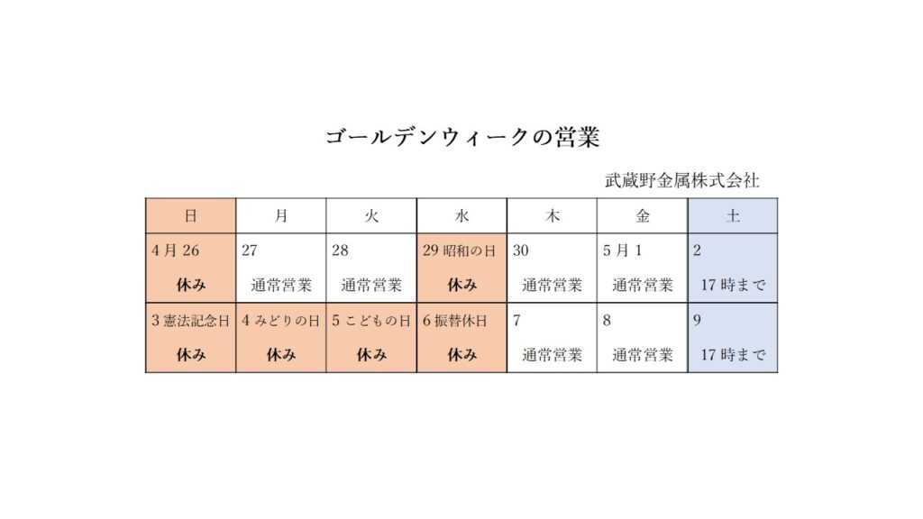 お知らせ NEWS ホームお知らせ2026年ゴールデンウイークのお知らせ 2026.04.01 2026年ゴールデンウイークのお知らせ 2026年のゴールデンウイークの休業日をお知らせいたします。 ご不便をおかけしますが、何卒よろしくお願い申し上げます。 4/29・5/3・5/4・5/5・5/6 は休業とさせていただきます。 一覧へ戻る